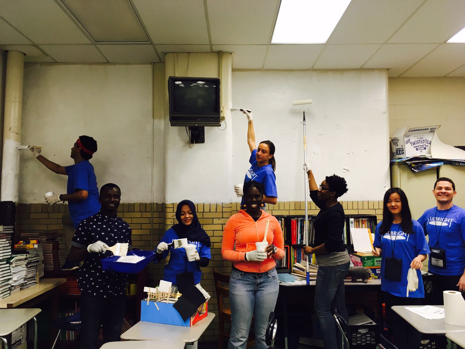 Our annual spring volunteer event was a great success! PNP members visited William T Tilden Middle School , just next door to John Bartram High, in Southwest Philadelphia. Although originally scheduled to do orchard planting, PNP Members picked up their paint brushes and helped provide much needed coats of paint to classrooms in Tilden. Organized by the Philadelphia Orchard Project and the City of Philadelphia Office of Civic Engagement & Volunteer Service (SERVE Philadelphia), we joined volunteer groups from all over the city and world, including a group from the Fulbright Program all in an effort to help beautify William T Tilden Middle School. Check out what you missed below!