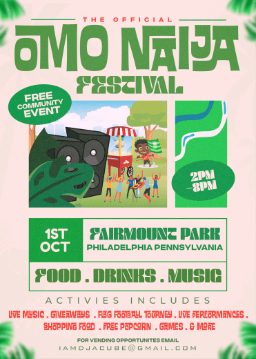 October marks the beginning of independence day season for many African countries, kicking off with our beloved Nigeria. Sunday October 1st, come out to Fairmount Park at 33rd & Oxford Streets for a free day of family friendly fun! Celebrate Nigeria by enjoying an afternoon of Nigerian Culture, Art, Fashion, Food, & Music. For more on sponsorship & vending opportunities, contact Festival Coordinator Abiola Ajibola (DJ ACube) at iamdjacube@gmail.com