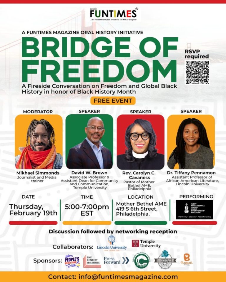 FunTimes Magazine, in collaboration with Lincoln University and Temple University, is launching the Bridge of Freedom Oral History Initiative; a project to document the untold stories of African and Caribbean co-leadership in the U.S. Civil Rights movement. Against the backdrop of Black History Month, join Funtimes Magazine for a fireside chat to discuss Black freedom and diaspora inter-connectedness at the historic Mother Bethel AME Church.